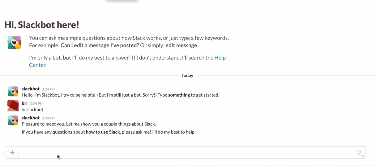They also have an adorable and helpful robot you can chat with called Slackbot. You can ask Slackbot questions about how to do things in Slack.