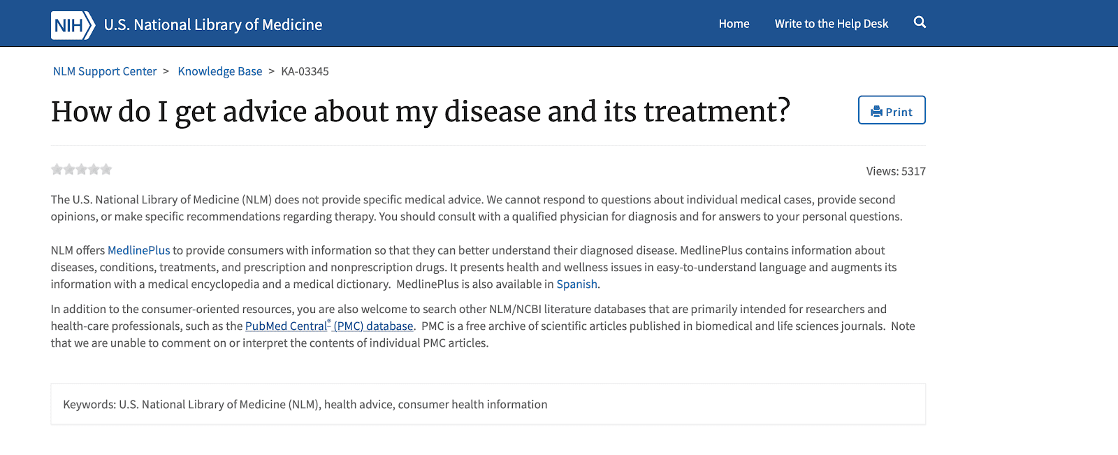 The NLM KB article, geared to the public consumer, explains what the library can and cannot do accurately. The KB article lists consumer and research portals, opening to the correct sites when clicking the link, making the KB article complete and timely. In addition, the article presents valid information about each resource that its visitors can verify.