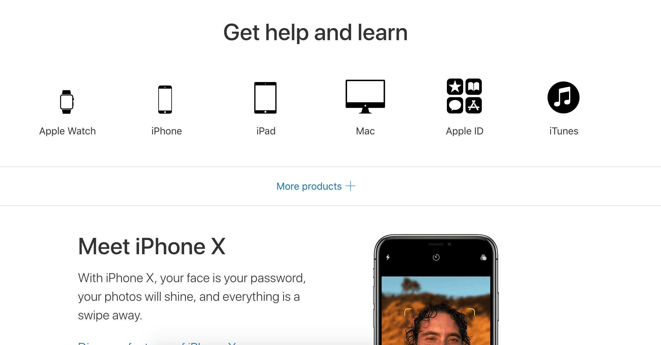 Their documentation reads like a sales page, with large glossy images and snappy sales copy. Its custom symbols for each one of its products gives the impression that Apple’s support docs will be detailed and specific.