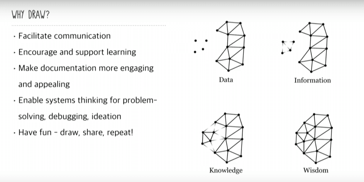 Many of us already bring visual design elements to technical writing. For example, during Subject Matter Expert interviews when we want to illustrate a concept better. Engineers already use diagrams when they are pairing, whiteboarding, debugging, and doing retrospectives. Salespeople use diagrams and draw on the back of a napkins when in conversation with prospective customers.