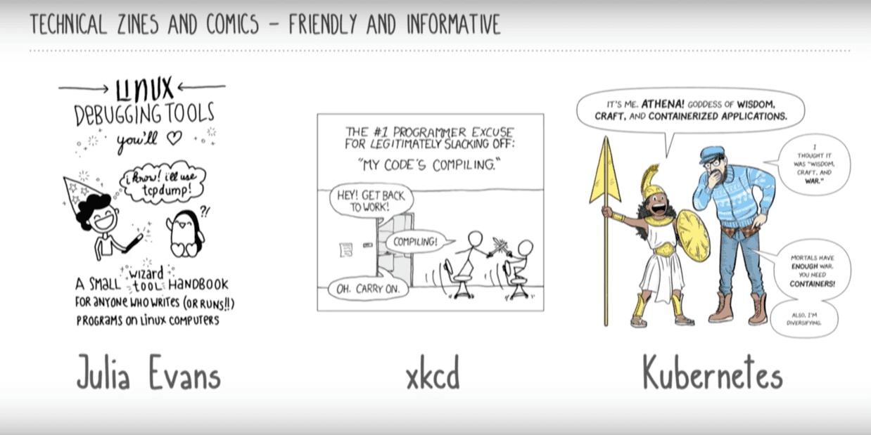 She shared some examples of technical zines and comics including xkcd, and Julia Evans, which inspired her to start drawing.