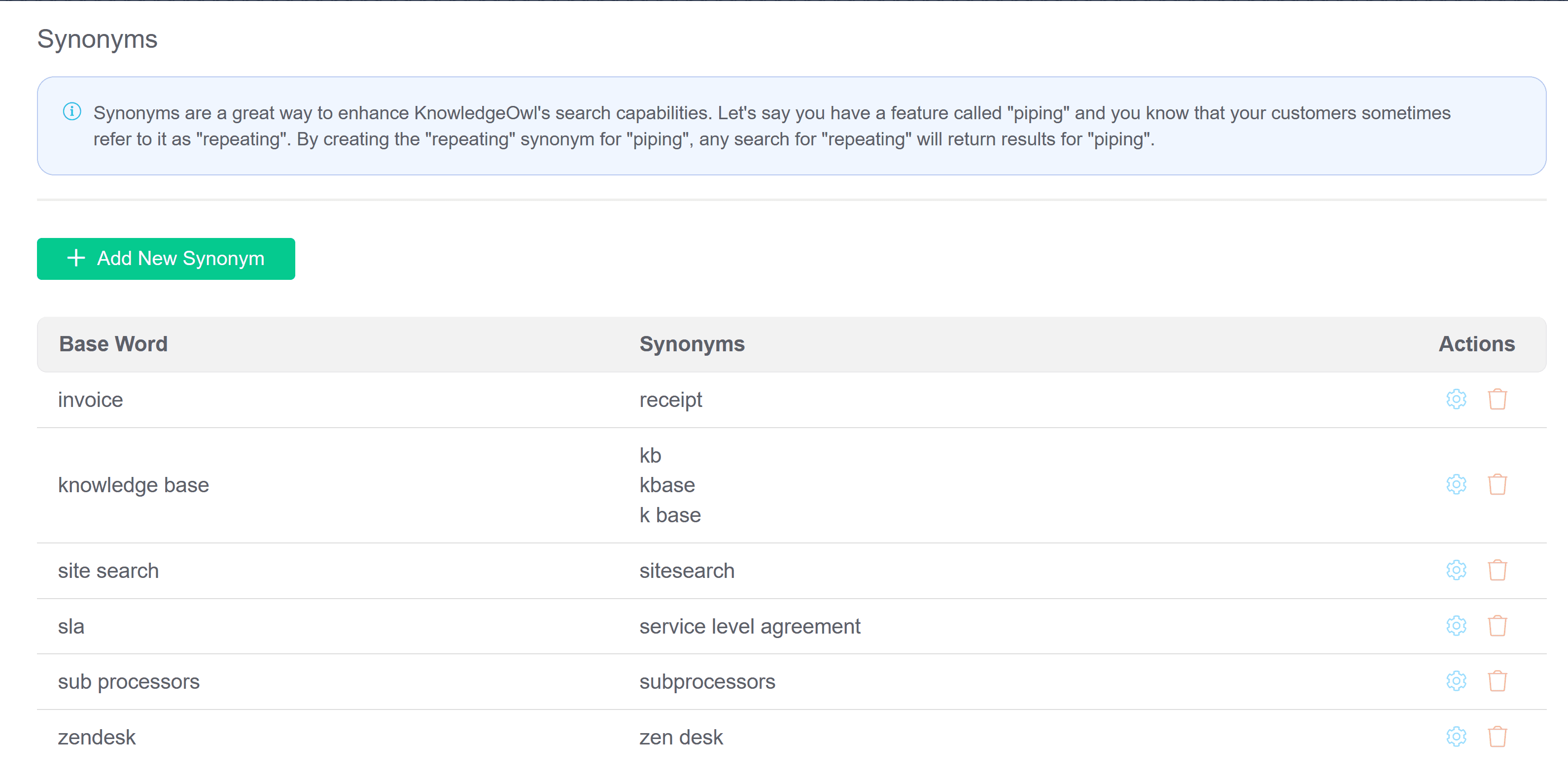 Use KnowledgeOwl's synonyms feature to enrich your knowledge base search.
