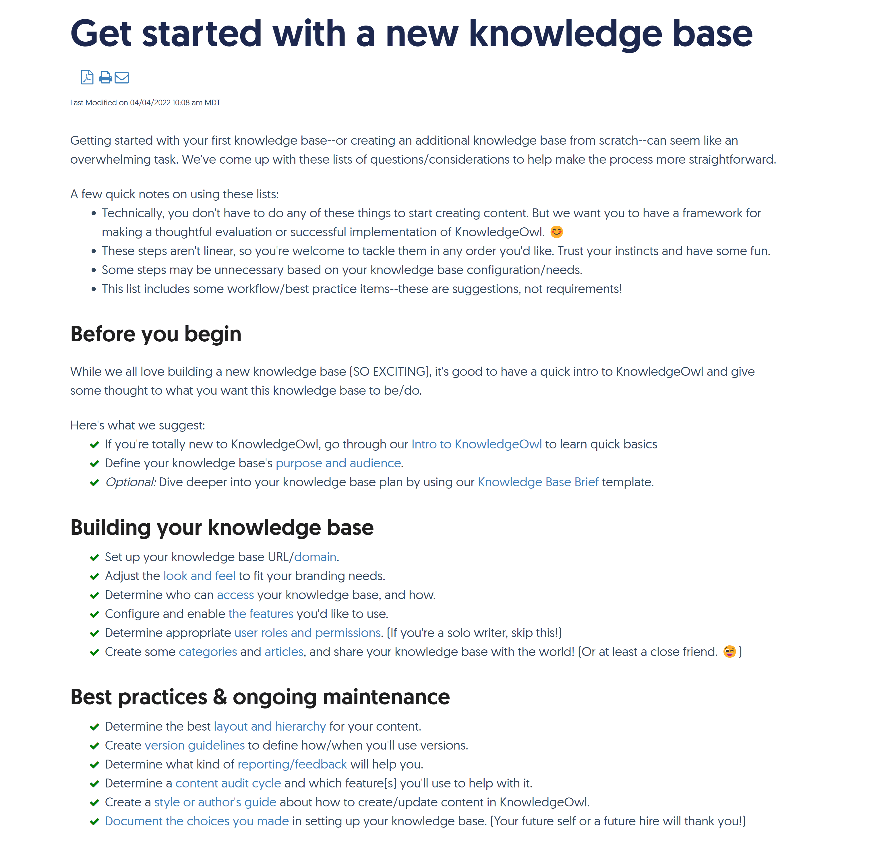 When I began working at KnowledgeOwl in October 2018, one of the first things I wanted to do was to update our Getting Started Guide. I tried to use it as an orientation document for myself and had all kinds of ideas for updating it. It took me until this month (April of 2022) to get a new guide launched. Here's a bit about why we made the change and how that process went.