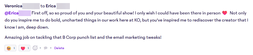 The appreciations can be large or small. Sometimes it’s one of us thanking someone else for doing a task that we personally didn’t want to do, or would have taken us much longer than it took them. Sometimes it’s just us appreciating our teammates for being who they are. Sometimes it’s us appreciating someone for being honest or pushing back on something during the meeting! And sometimes we’re sharing personally exciting announcements, like Erica’s latest art show. 😉