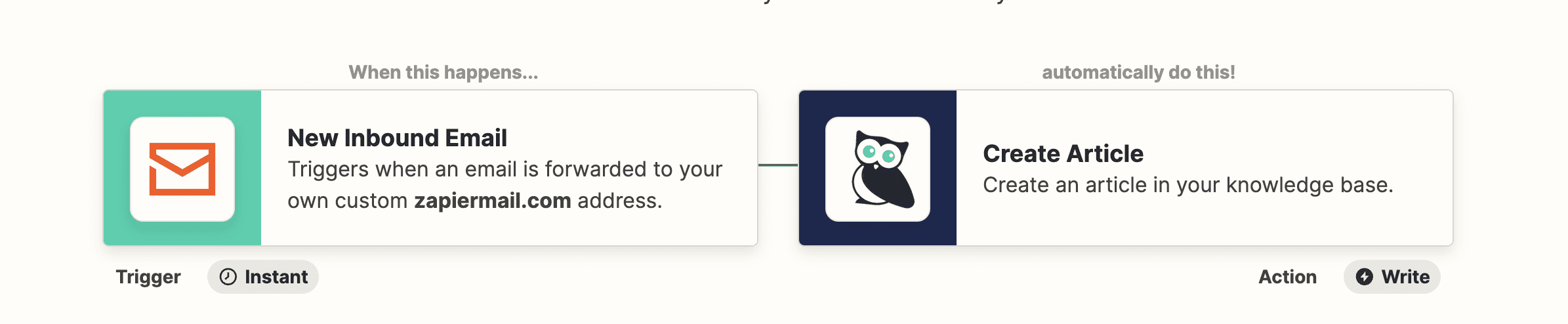Also, you can use the "Create Article" Action to automatically create KnowledgeOwl articles from a trigger in another tool. For example, you can create a Zap that will automatically create a KnowledgeOwl article from an email.