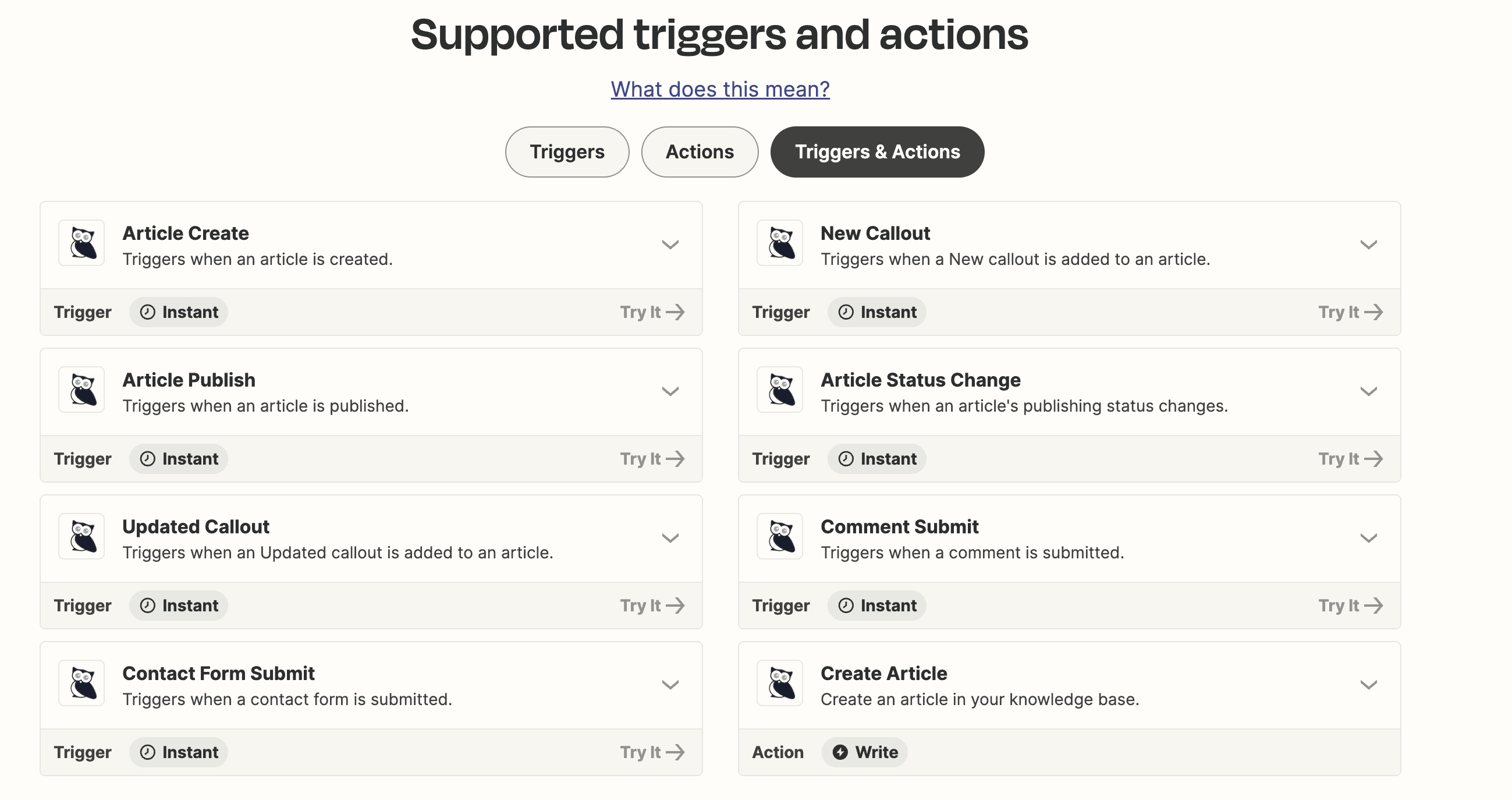 You can use the new and improved official KnowledgeOwl integrations app to create your own Zaps and automations using any of the supported triggers and actions.