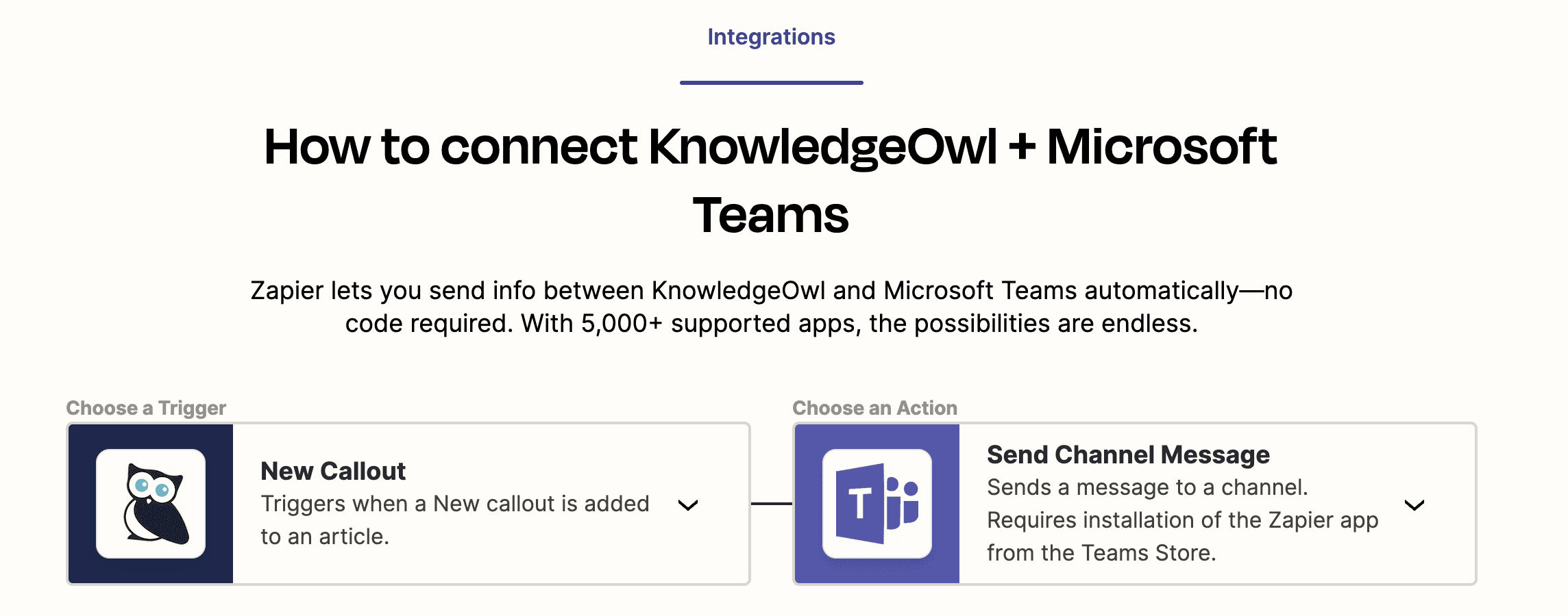 With the KnowledgeOwl integrations app, you can create Zaps based on any of these triggers that will automatically perform an action in another app. For example, you could send a message to a Teams channel whenever a new callout is added to an article.