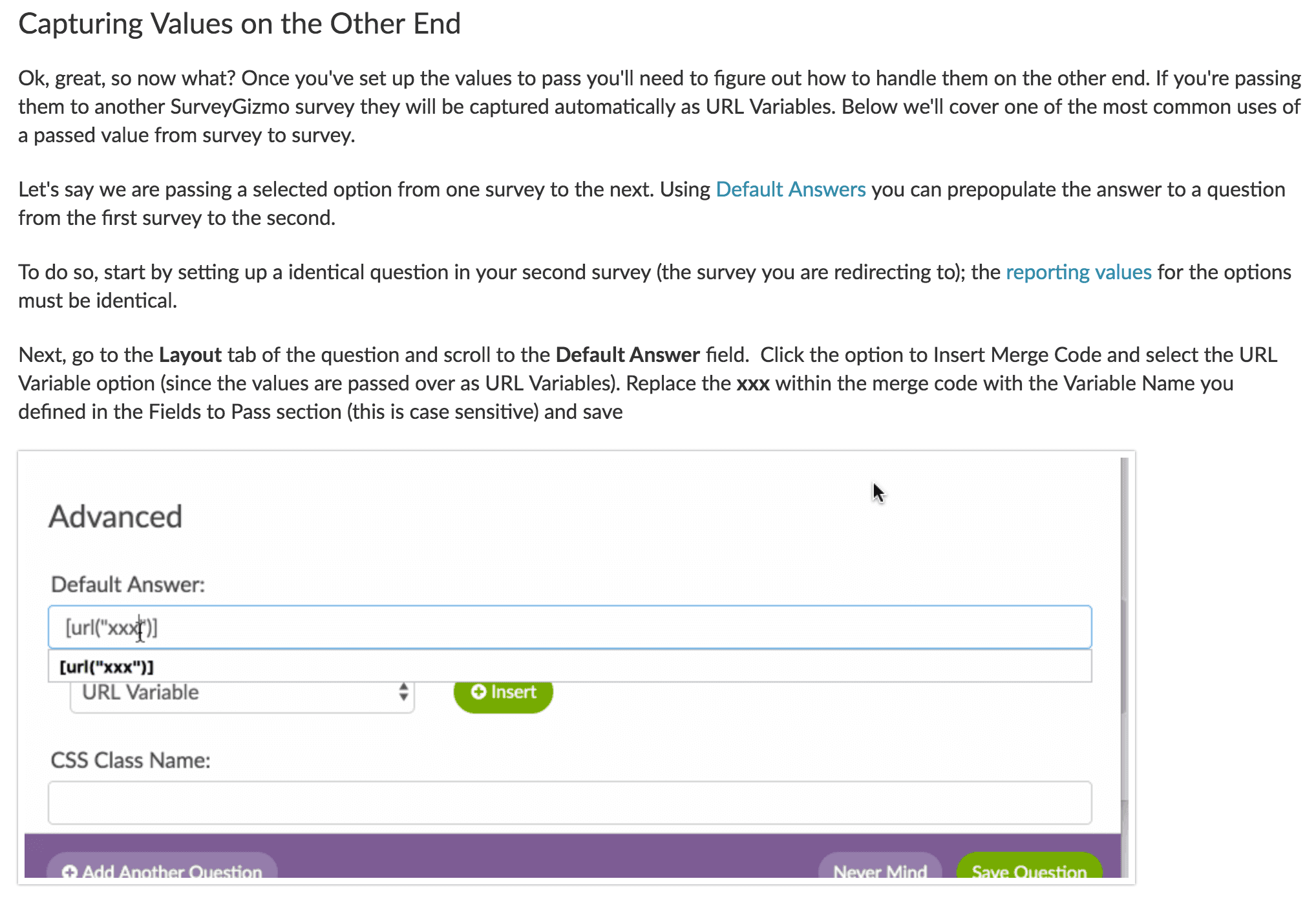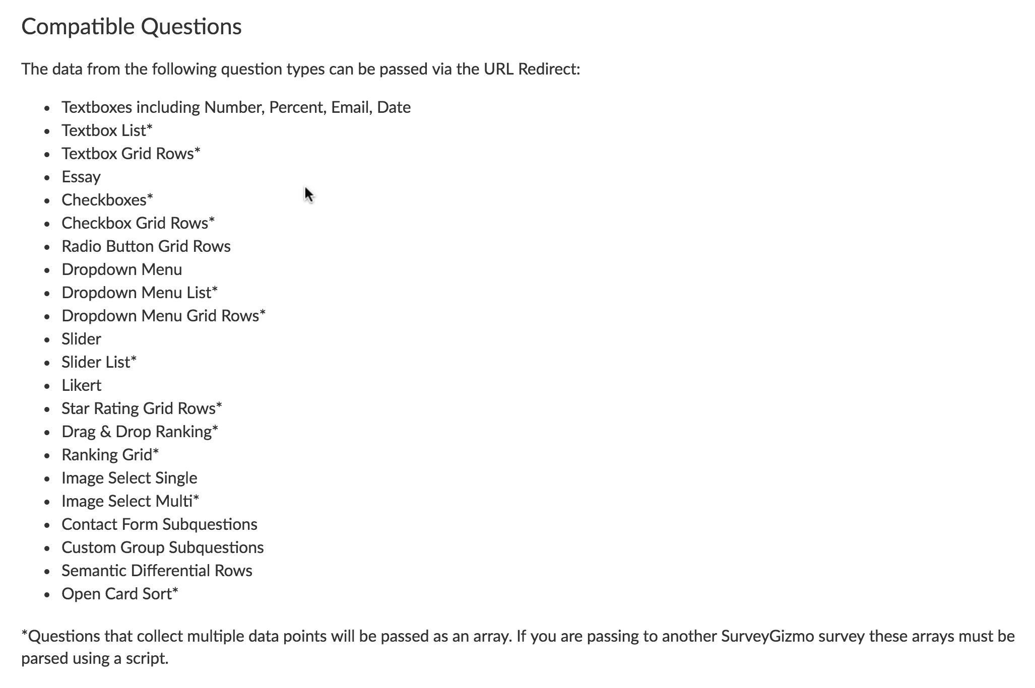 The second new section covered SurveyGizmo question types that are compatible. Because, duh, this is important information! The customer also pointed out that I needed to address what happens when passing multiple data points, hence the asterisks noting how this works too!