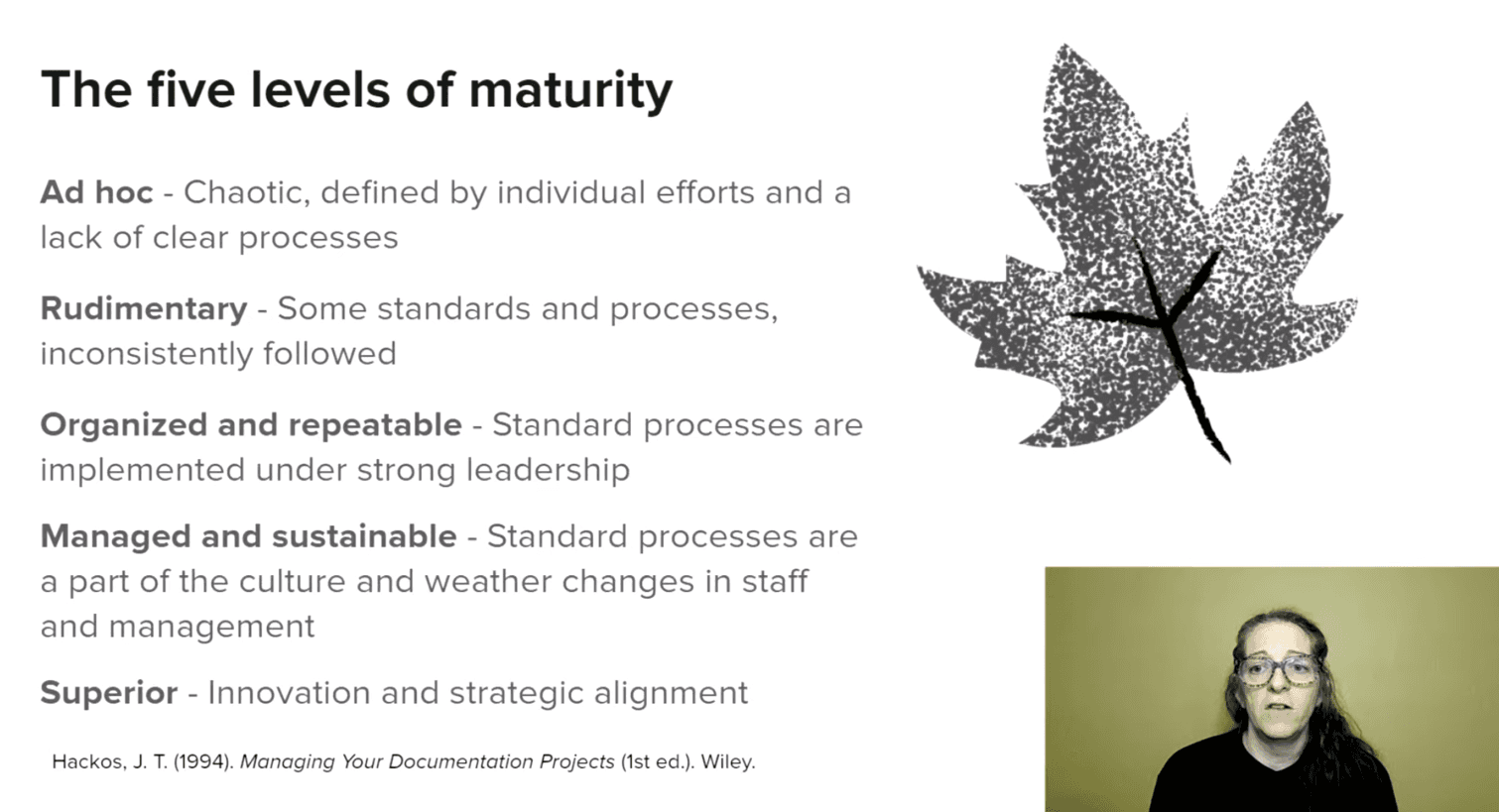 Sarah talked about metrics technical writers use to measure the impact of their work and guide their docs strategy and why they fall short. She went on to introduce the concept of the maturity model and how to apply that to your docs.