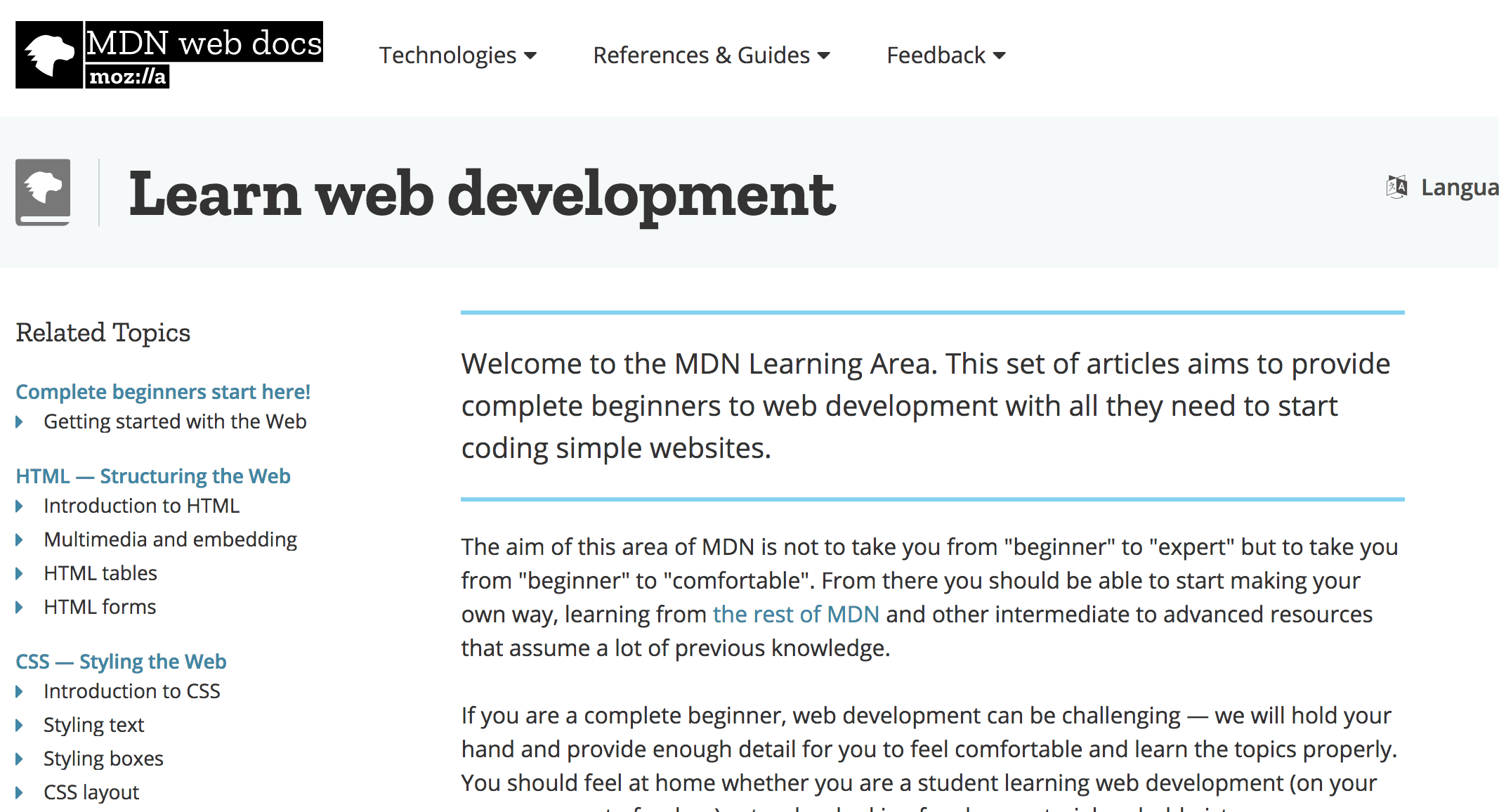 Mozilla doesn’t advertise its documentation on the main site because they want to avoid confusion with their official products. Once you get to their knowledge base, you can then choose between a variety of options. One of these is ‘Learn web development’.