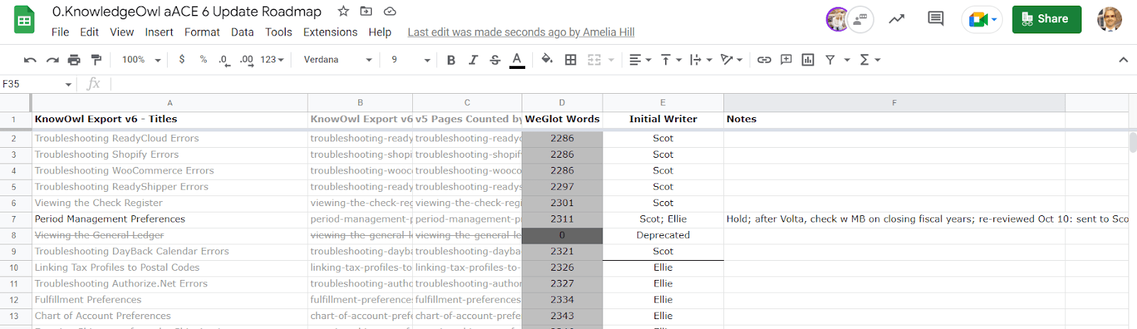 With a little massaging, I had a list of guides complete with word count. I sorted that list by ascending word count (for the low-hanging fruit), then added a column for each intern to 'claim' a guide and a column for comments: