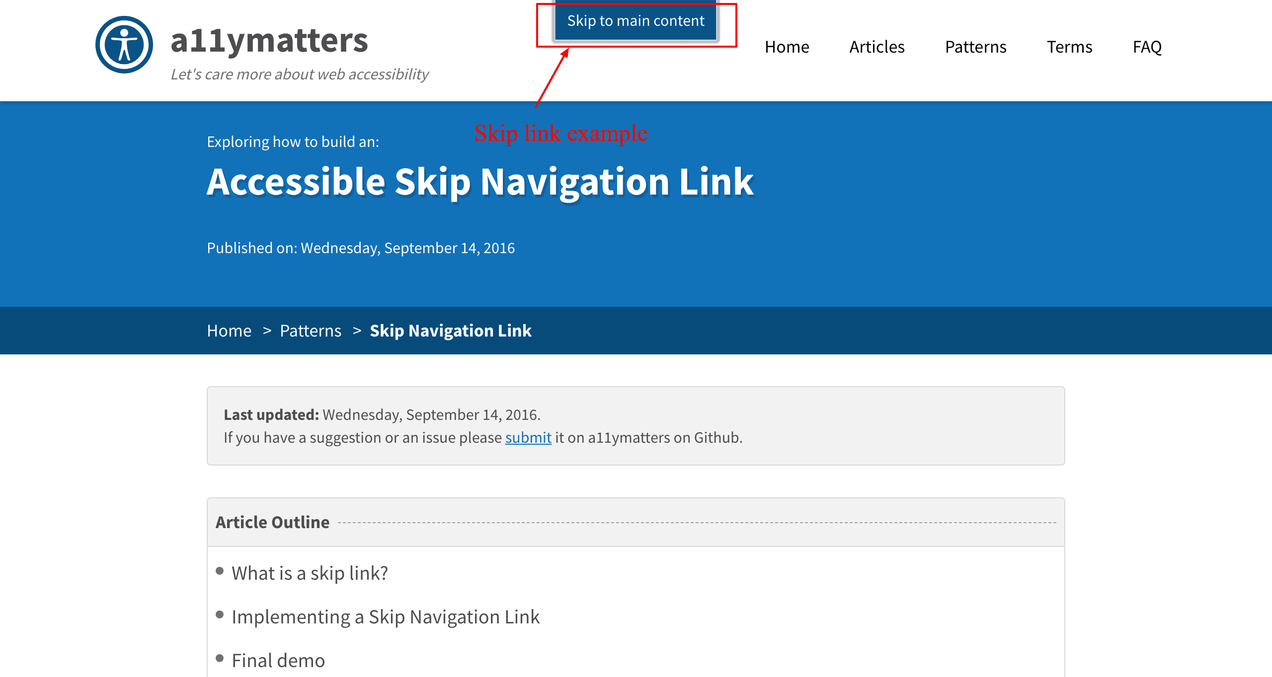 Skip links help you skim over redundant content, instead of having to click through every single element to get to the right place.