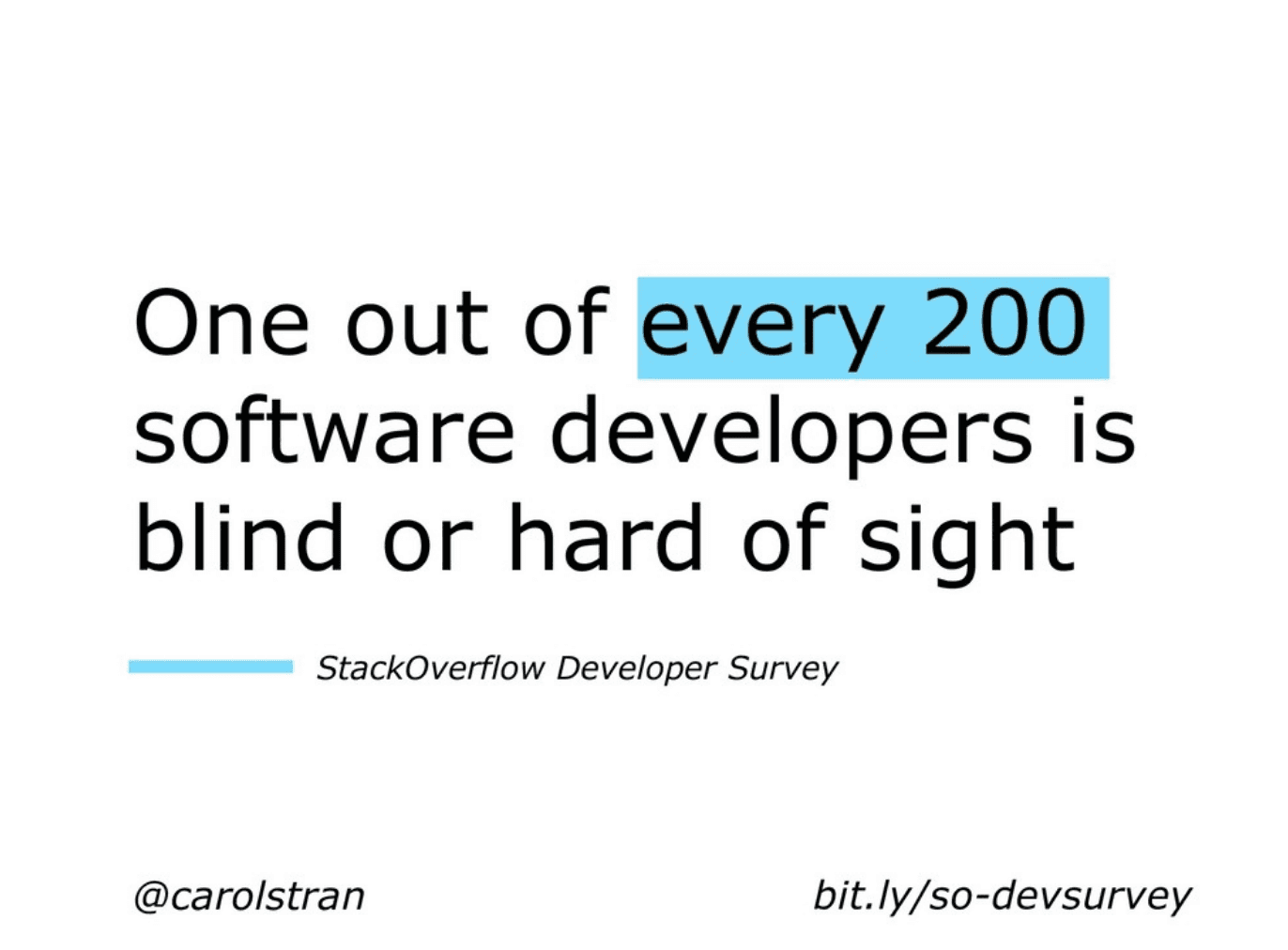 Although everyone has the tendency to operate from within the realm of their own biases, many people have differing needs when it comes to documentation. For example, one in every 200 developers is blind or hard of sight.
