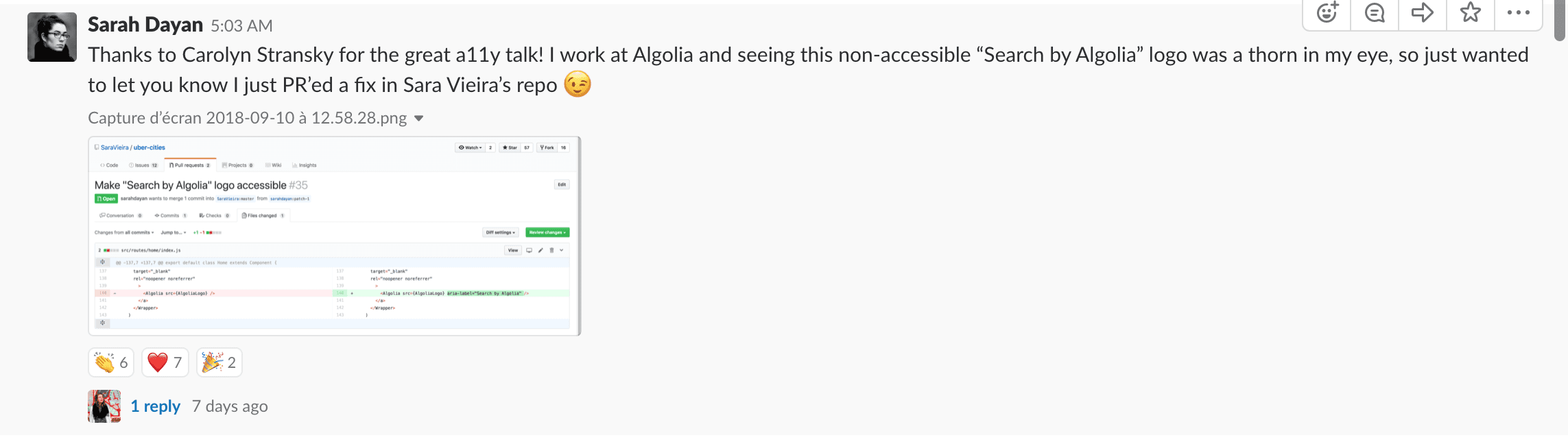 As a result, the team at Algolia updated that part of their website to make it more accessible, which they also shared in the Write the Docs Slack channel.