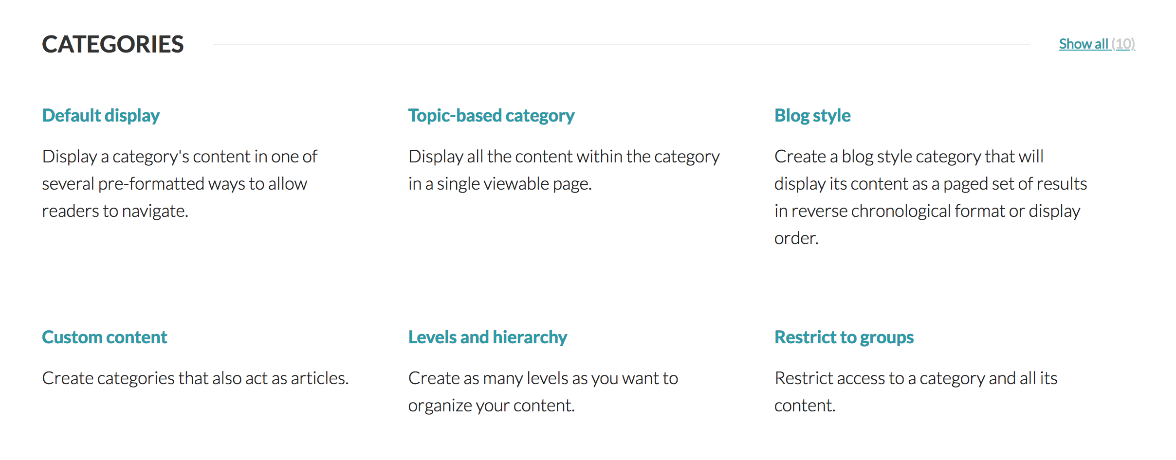 Your top-level categories should be broad enough areas that your customers will expect to see when they get to your knowledge base.