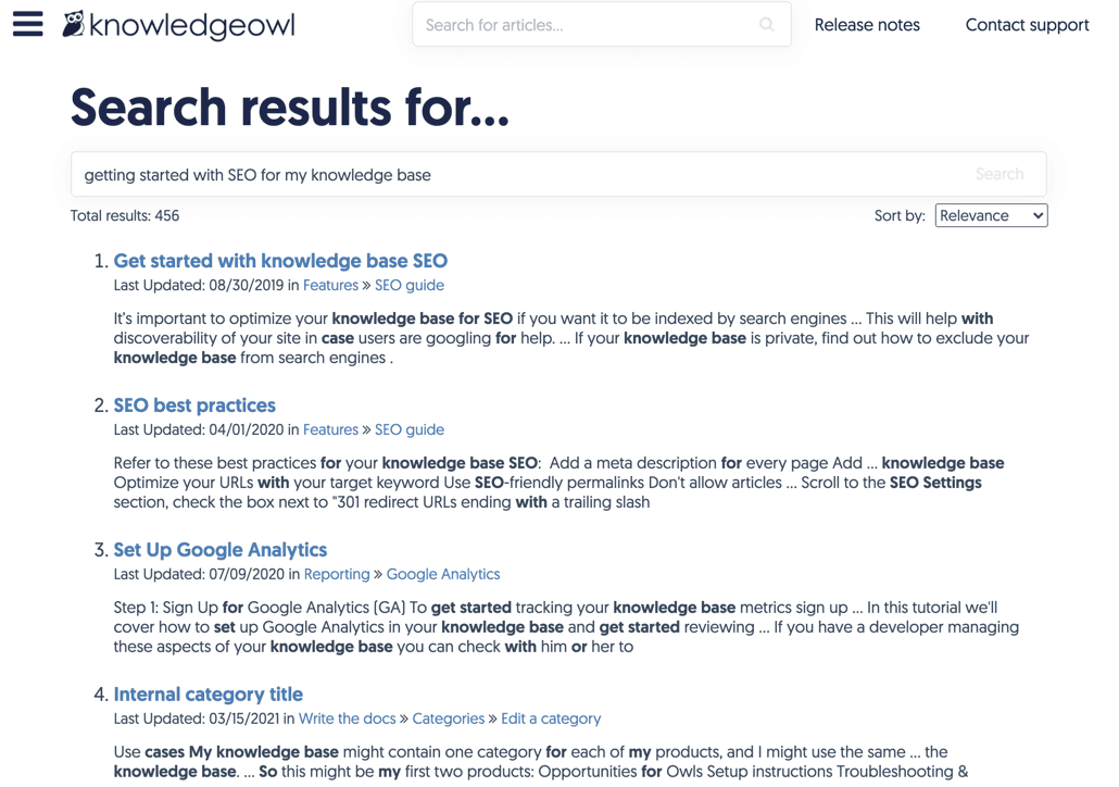 Even more important, however, is optimizing your knowledge base content for search. When your users type a query into the search bar, relevant and useful content must come up. If you don’t have a good search functionality on your knowledge base then eventually you will have too much content for users to navigate effectively.