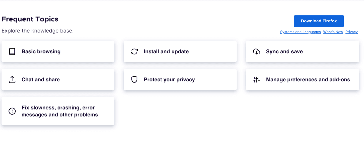 Firefox is an internet browser company and they provide a very simple knowledge base for their varied users. The emphasis is on search and Firefox provides a short list of popular searches. There is a link at the top to ask the community for help, since Firefox is a not-for-profit organization and they don’t have software support teams at the ready. Further down the page Firefox includes a list of top software categories so customers can search by product.