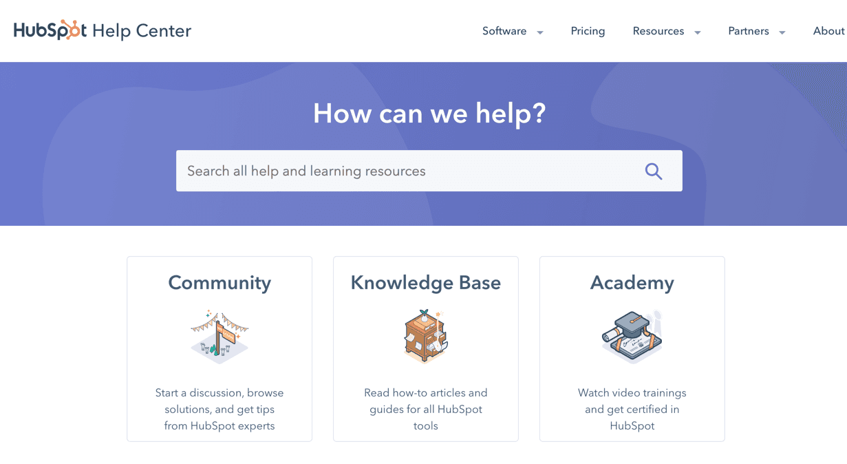 Hubspot is a sales software company which provides a fantastic knowledge base that puts search front and centre. You can see how Hubspot are really dedicated to helping their customers by offering a Community, Knowledge Base, and their Academy.
