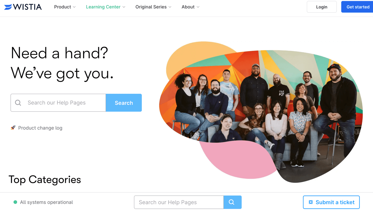 Wistia is a video software company and they provide a beautiful knowledge base for their users. There’s a status bar at the bottom of the page which shows that all their systems are operational, along with a floating search bar which means customers can search from any page. There’s also an easy way to submit a ticket, meaning customers are never more than a click away from human help.