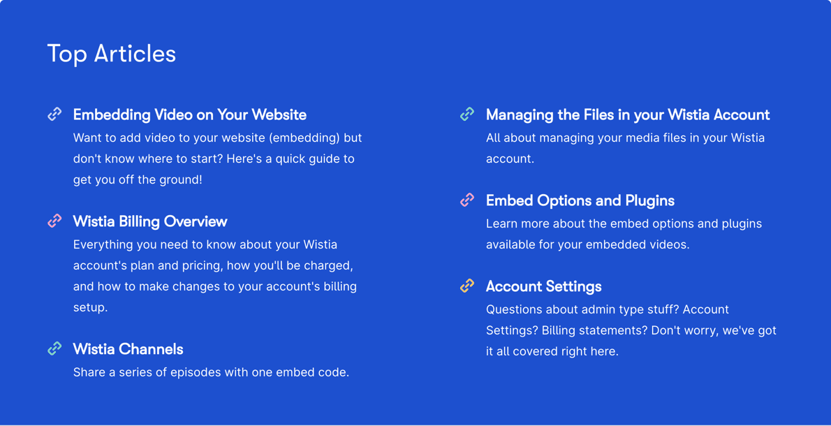 Wistia follows up with a list of top articles on the homepage so customers can easily browse content that has been an issue for others like them.