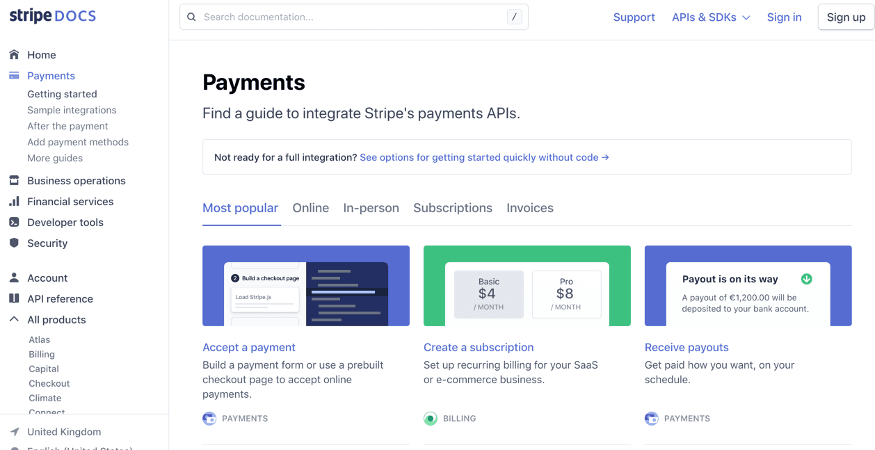 Stripe is a payment processing company and they link to their docs directly from the homepage. This is a good sign as it shows how important the support knowledge base is. Stripe has opted to anchor their navigation menu on the left so customers always have a full overview of the different content categories. There’s a small search bar at the top of the page but Stripe surfaces popular articles right up front. You can toggle through a few different categories to find what you need.