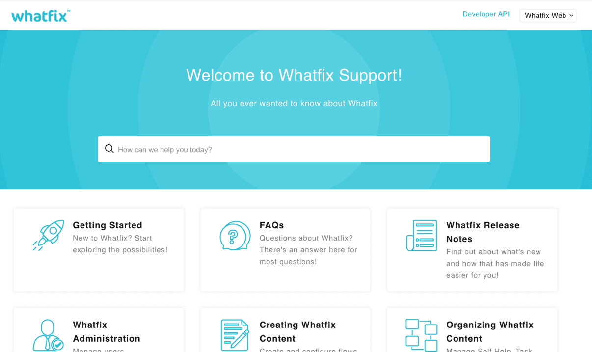 Digital adoption platform company Whatfix provides an easy to navigate knowledge base for their users. It gets straight to the point with a search bar then presents categories for easier browsing. The color scheme is easy on the eyes and on-brand with the rest of Whatfix.