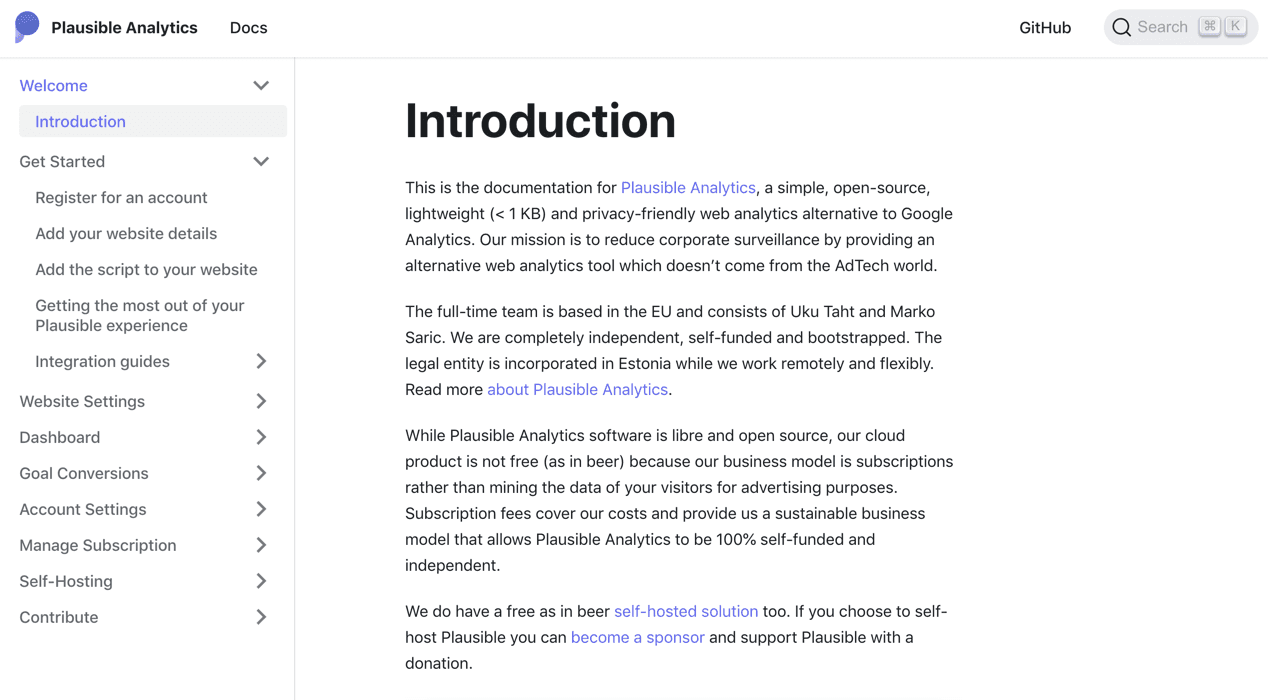 Plausible is a website analytics company and they provide a very simple, refreshing knowledge base for their users. There is a small search bar at the top of the screen, but otherwise the content categories are laid out on the left-hand nav. Customers feel comfortable just clicking through the content to find what they need. The company is open source and this fact is reflected in having the ability to edit any of the pages using Github.