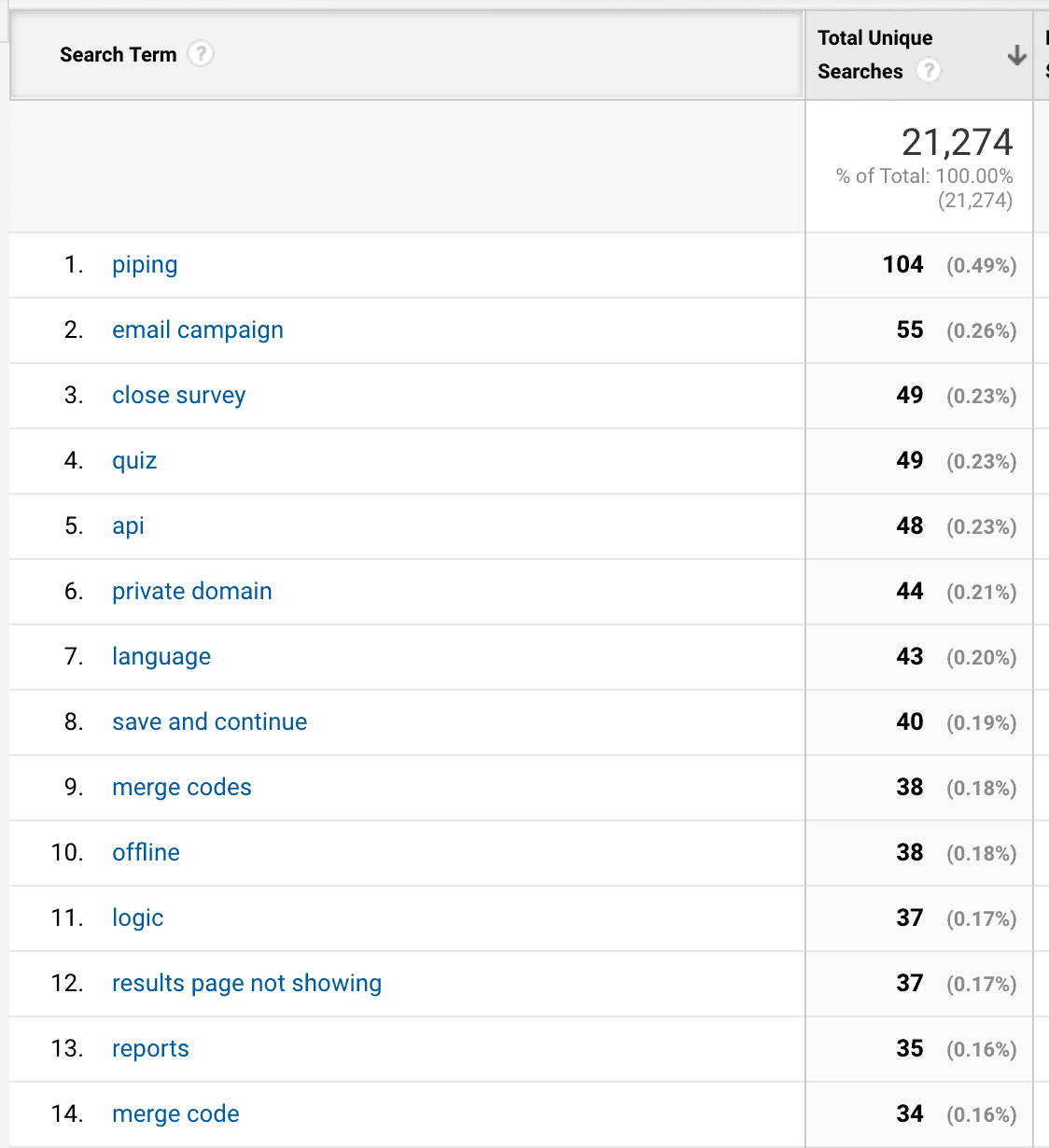 The most frequent searches will be listed first. These will often reflect the names of features within your software. These searches are probably performed by users that know your software pretty well.