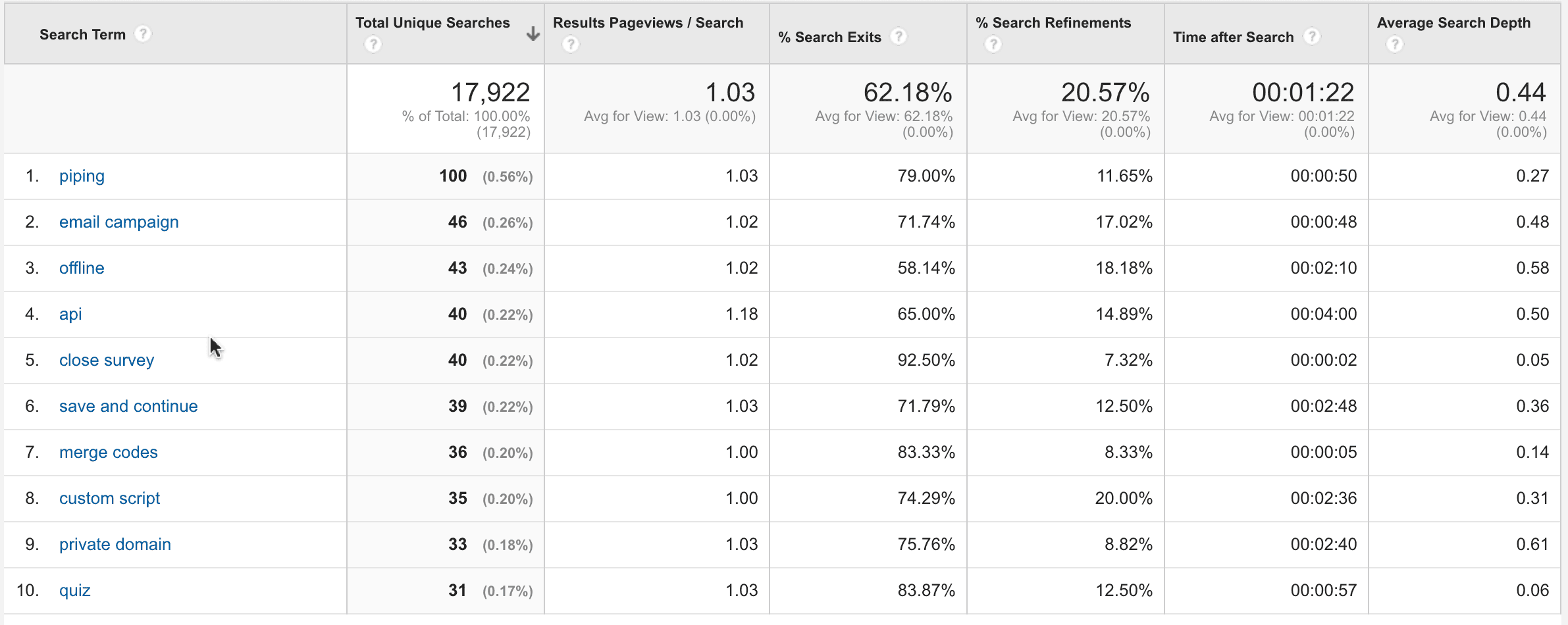 Once it is set up Site Search provides you with the terms and phrases users are searching. As the data aggregates over time start by noticing the trends in your data.