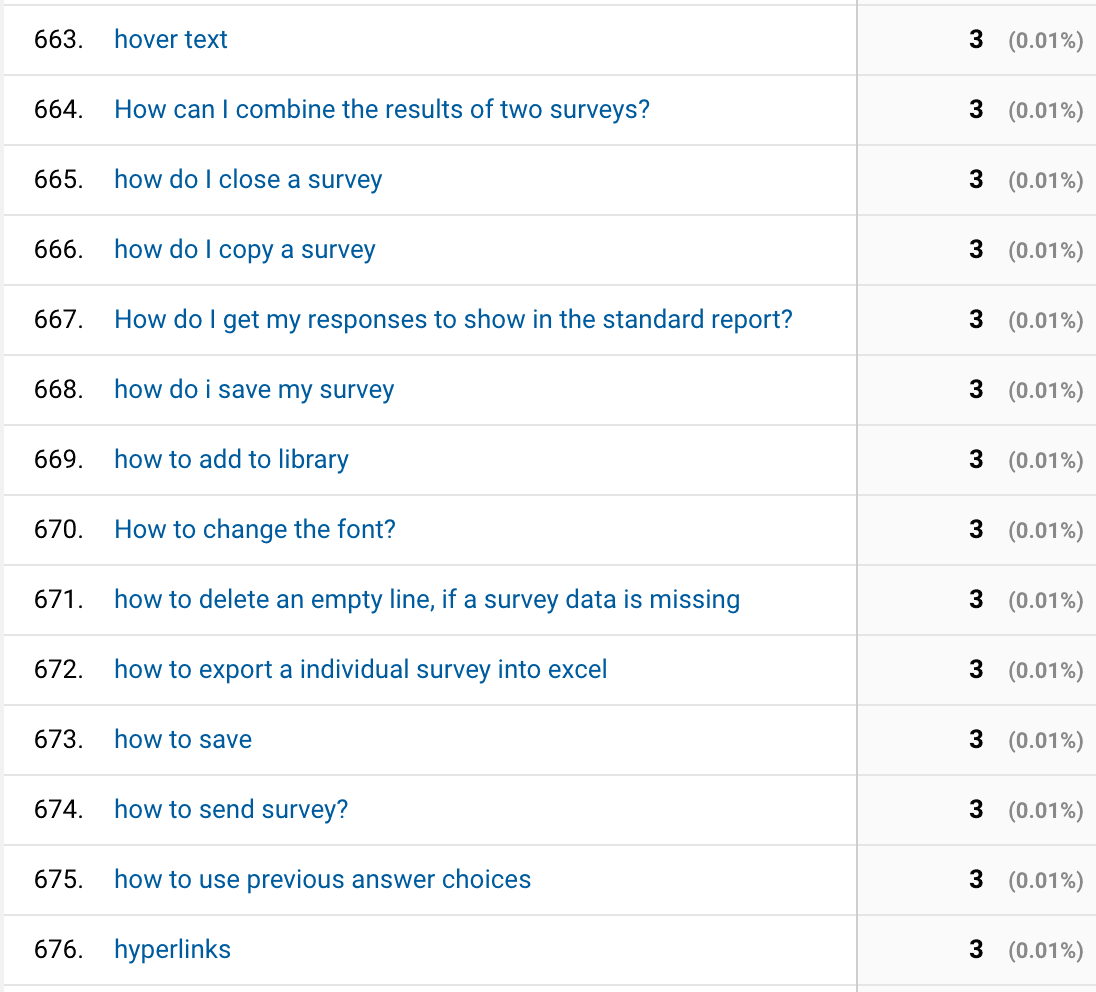 For example, "close survey" and other variations of what customers search when trying to figure out how to close a survey have long been a popular search term in our documentation.