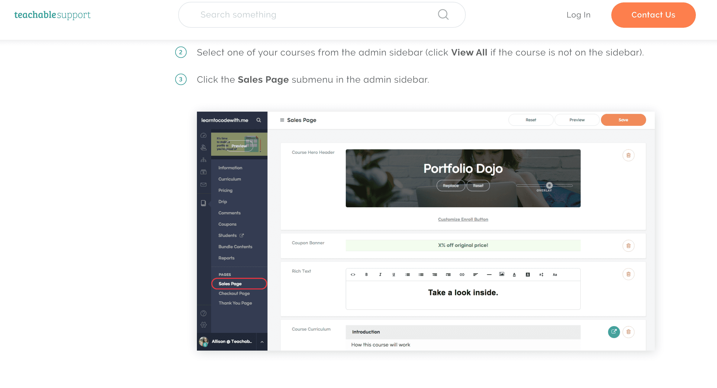 Online course software company Teachable show their users how to use their editor with a screenshot and a small visual cue.