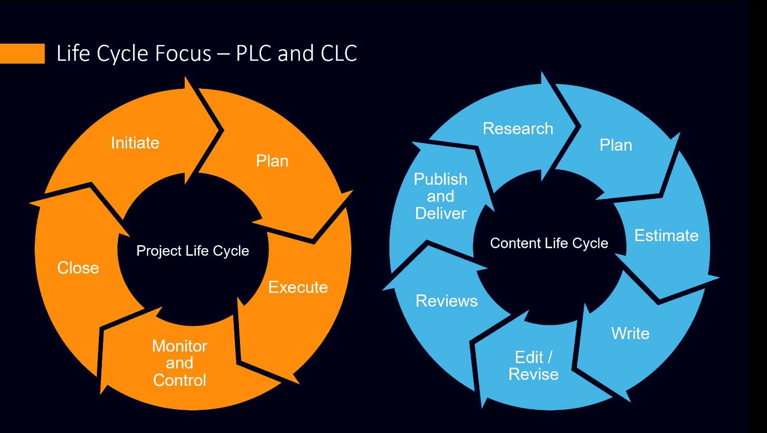 The following diagram depicts phases in a Content Life Cycle and a Project Life Cycle.
