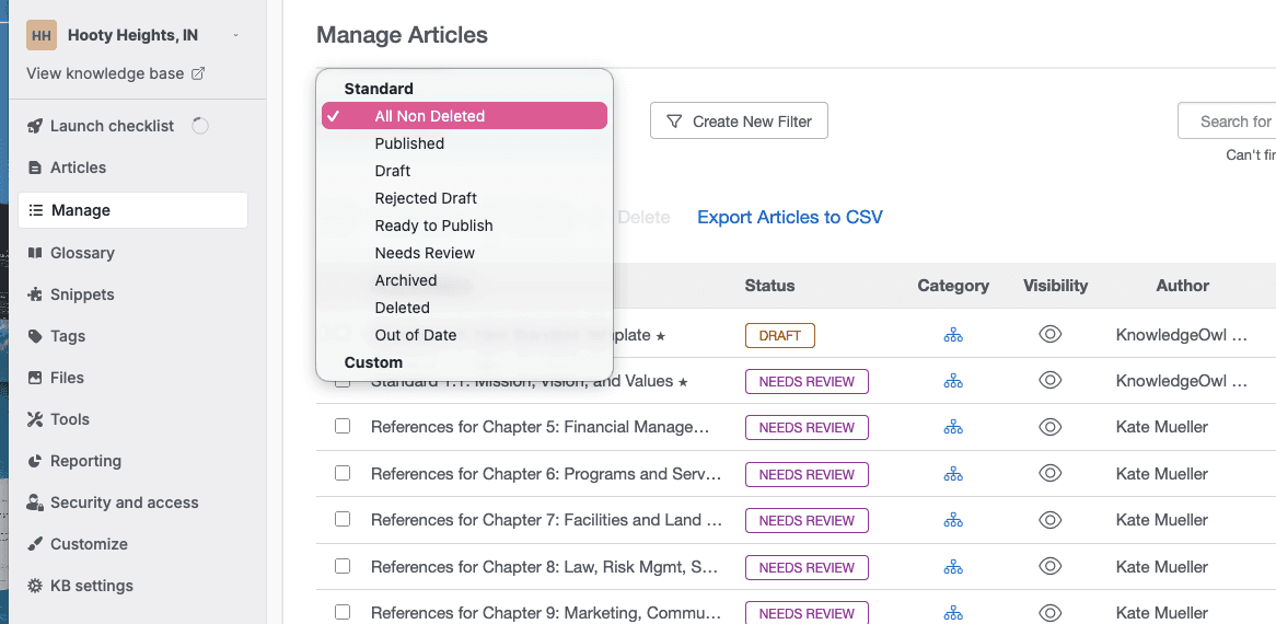 You don't start with a blank page. Once you let us know you're ready, our support team takes the latest CAPRA template and installs it directly as a new knowledge base in your KnowledgeOwl account. Every chapter and standard from the current CAPRA accreditation standards is already there, organized and waiting. Each individual standard comes pre-marked with a "Needs Review" status, so from day one, you know exactly where you stand and what still needs your attention. We also include a sample standard so you have a concrete model to follow as you get started.